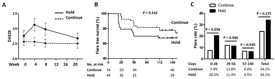 Results: In the 4-week MTX-hold group, the mean DAS28 increased at the 4 weeks after MTX discontinuation by 0.38 ± 0.94 and then improved back to baseline after reintroduction of MTX, whereas the mean DAS28 in the MTX-continue group remained stable over time (Figure 1A). The overall flare-free survival during 20 weeks did not differ between the groups (log rank p=0.142) (Figure 1B). However, numerically more patients in the MTX-hold group experienced a flare than those in the MTX-continue group during the 4-weeks MTX discontinuation (20.5% vs. 7.4%, p=0.058). After resuming MTX, the flare rate did not differ between the groups up to 20 weeks of observations (Figure 1C). A temporary MTX discontinuation for 2 weeks was not associated with any clinically meaningful change in disease activity.