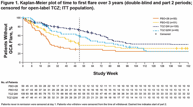 Conclusion: Nearly half the pts treated with TCZ QW maintained CR for the entirety of part 2, though flares still occurred in the remaining pts once they discontinued TCZ treatment. Among pts who maintained CR in part 2, higher proportions of those originally assigned to TCZ were treatment-free compared with those originally assigned to PBO. Retreatment with TCZ restored CR in pts who experienced flare. Cumulative GC doses over 3 years were lower in pts originally assigned to TCZ than in those originally assigned to PBO. No new safety signals were observed with TCZ exposure in GCA pts during the 3-year study.