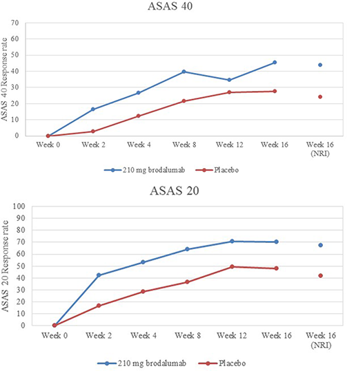 Methods: In this phase 3, multicenter, randomized, double-blind, placebo-controlled study conducted in Japan, South Korea and Taiwan, eligible axSpA patients were randomized 1:1 to brodalumab subcutaneously (s.c.) 210 mg or placebo at baseline, weeks 1 and 2, every 2 weeks thereafter. At week 16, all subjects entered an open label extension phase and received brodalumab 210 mg s.c. Q2W. ASAS 40 (Assessment of SpondyloArthritis international Society) response rate at week 16 was the primary endpoint. Secondary outcomes and safety profiles were also assessed.
