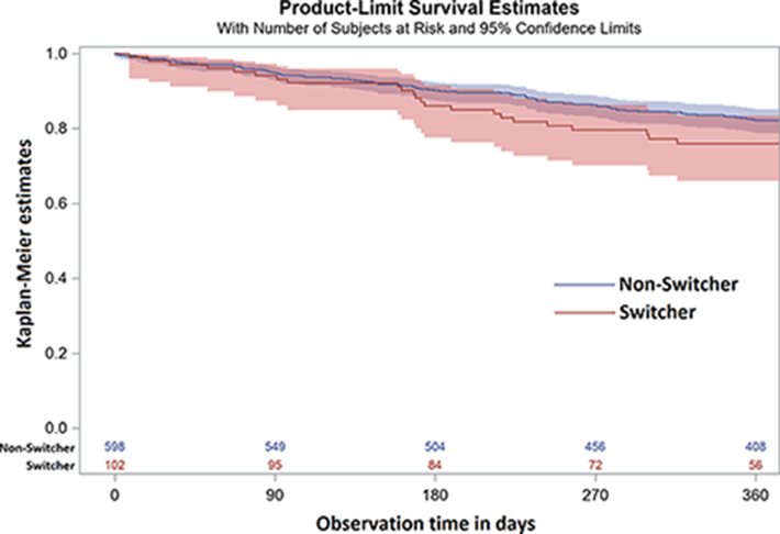 Results: Overall, 1,751 patients fulfilled the inclusion criteria of whom 113 were switched to bsETA. Of these, 102 switchers could be matched to 598 patients who remained on oETA. In both groups, 78% of the patients were female, mean age was about 59 years, DAS28 was 3.2 and physical function as well as numbers of prior biologics were similar. Patients who remained on oETA were more often rheumatoid factor positive (71% vs. 63%), had more erosions (56% vs. 47%) and had more frequently three or more comorbidities (34% vs. 28%) than those who were switched to bsETA. The most common reason for switching was costs (79%). After one year, 35% of the patients in both groups had stopped the respective treatment (oETA, n=210, bsETA, n=36). The main reasons for withdrawal were loss of efficacy (oETA: 57%, bsETA: 36%) and adverse events (oETA: 20%, bsETA: 42%). In both groups about the same portion of the adverse events that led to treatment discontinuation were serious events (24% vs. 27%). Kaplan-Meier curves showed similar retention rates over 12 months for bsETA and oETA (figure). Nine bsETA patients were switched back to oETA.