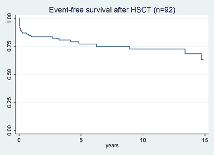 Objectives: To describe event-free survival and TRM after HSCT and to evaluate the predictive value of baseline characteristics. Event-free survival was defined as the absence of mortality or major organ failure (i.e. cardiac failure (left ventricular ejection fraction (LVEF) < 30%, respiratory failure (resting PaO2 < 8kPa/60 mm Hg or PaCO2 > 6,7 kPa or chronic oxygen supplementation), or renal failure requiring dialysis.