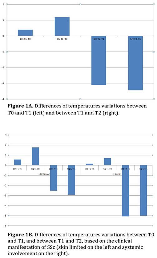 Methods: Twenty-six SSc patients [2], attending our Department for their routinely 28-days apart intravenous therapy with prostanoids (Iloprost) based on the presence of severe secondary RP and/or digital ulcers, were enrolled in this study. Thermographic evaluation of both hands was made at baseline (T0), and at days 14 and 28 after the first prostanoid infusion (named T1 and T2, respectively). Statistical analyses have been performed and a p-value <0.05 was considered statistically significant.