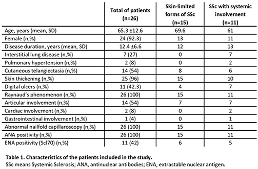 Results: A total of 26 SSc patients, 24 (92.3%) female, mean age 65.3±12.6 yrs, mean disease duration at time of data collection 12.4±6.6 years, were prospectively enrolled in the study. Among them, 15 patients (57.7%) presented with limited cutaneous SSc, while 11 patients (42.3%) showed an extra-cutaneous form of the disease. Demographic, clinical, and laboratory characteristics of the patients included in the study are detailed in