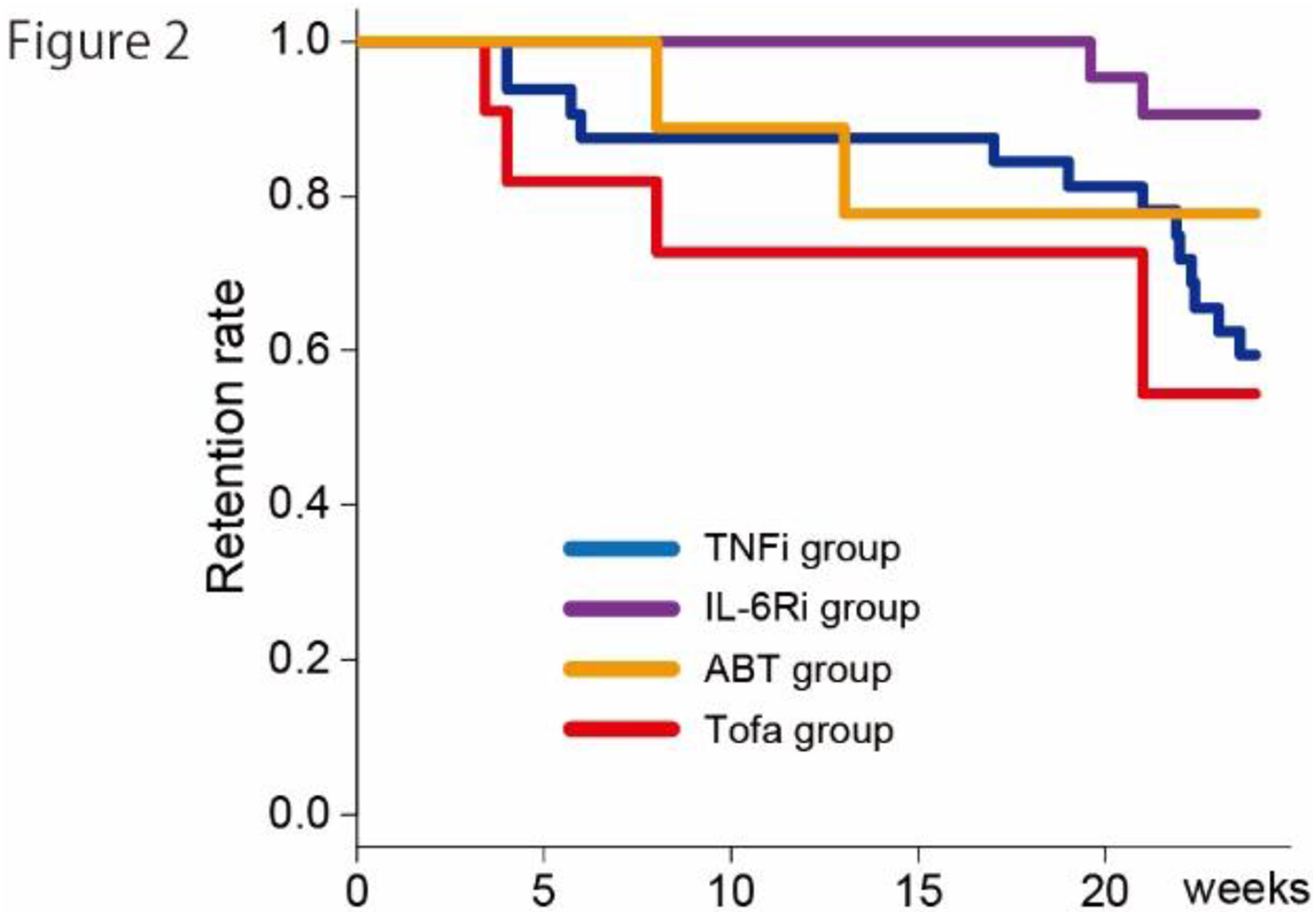 Methods: RA patients who had been treated with baricitinib after failure of the previous agent were registered in the TBCR, a Japanese multicenter registry for RA patients treated with biologics or JAK inhibitors and followed for at least 24 weeks. Patients were divided into two groups according to the cause of failure of the previous treatment; IR (“After IR” group) and the others (“After non-IR” group). “After IR” group was further divided into four groups according to the previous agent; TNF inhibitor (TNFi group), IL-6 receptor inhibitor (IL-6Ri group), abatacept (ABT group) and tofacitinib (Tofa group). We assessed disease activities by CDAI score and drug retention rates between these groups. Furthermore, discontinuation rates due to IRs and adverse events (AEs) were evaluated.