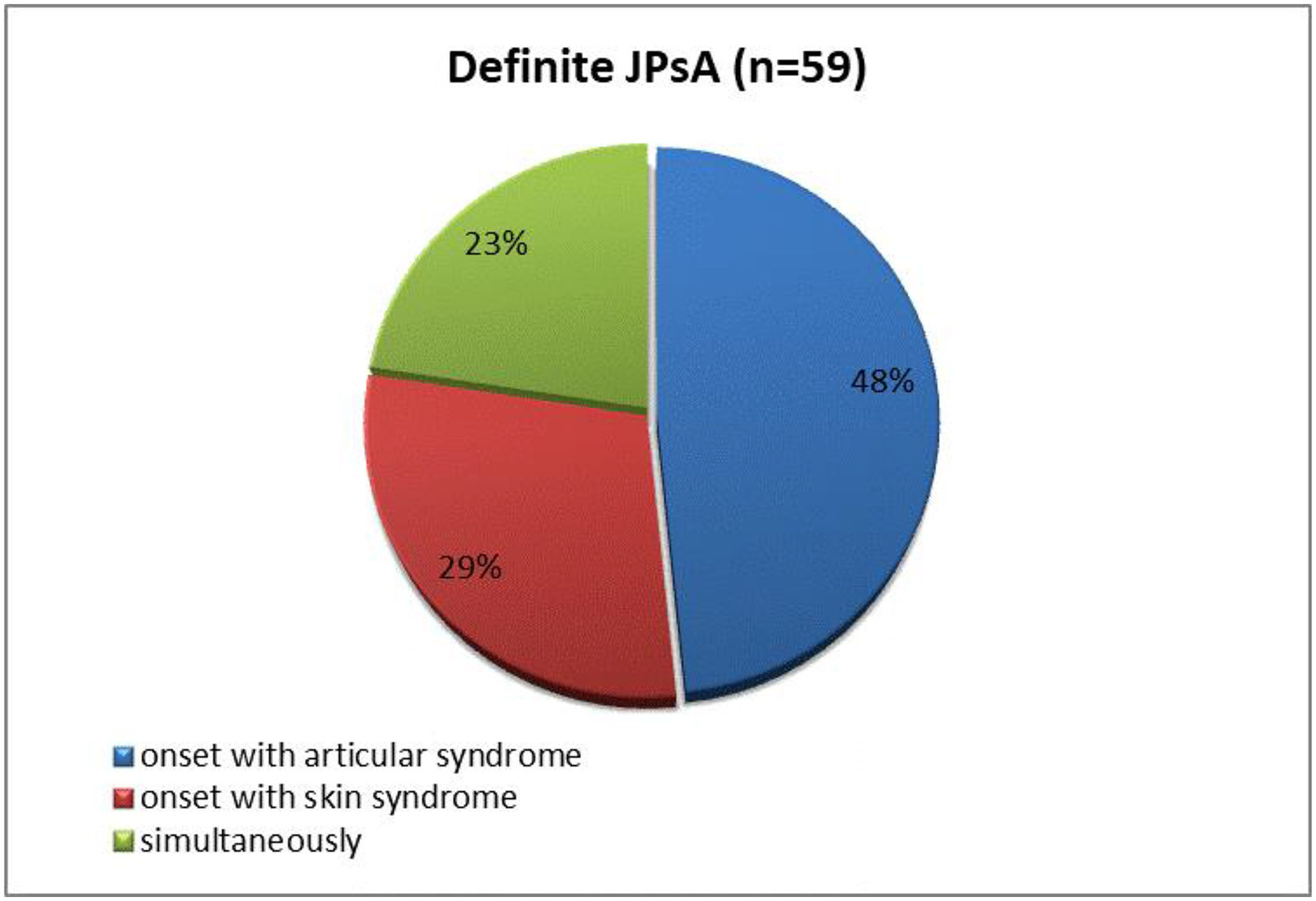 Among 59 patients with definite JPsA, vulgar psoriasis was observed in 45 (76%) patients, guttate psoriasis in 9 (15%), isolated nail psoriasis in 3 (5%), and palmoplantar psoriasis in 2 (4%). Fifteen (28%) patients had a combination of cutaneous psoriasis with damage to the nail plates.