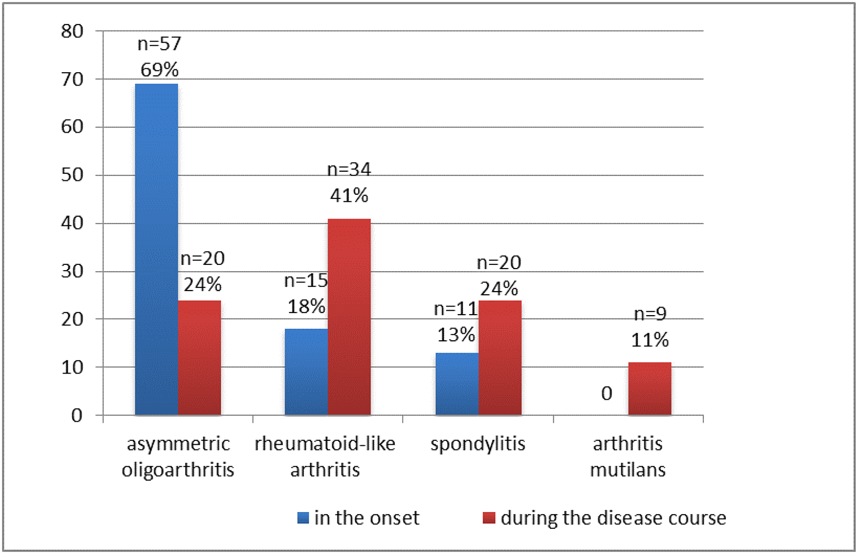 Articular syndrome in the onset of the disease was represented by oligoarticular arthritis in 57 (69%) patients, in 15 (18%) children - symmetric rheumatoid-like arthritis, and in 11 (13%) - spondylitis. The most commonly involved joints at both presentation and during the course of the disease were the knee (41%), ankle (31%), and small joints of the hands (29%). During course of the disease, the articular syndrome transformed with symmetric rheumatoid-like arthritis prevalence (
