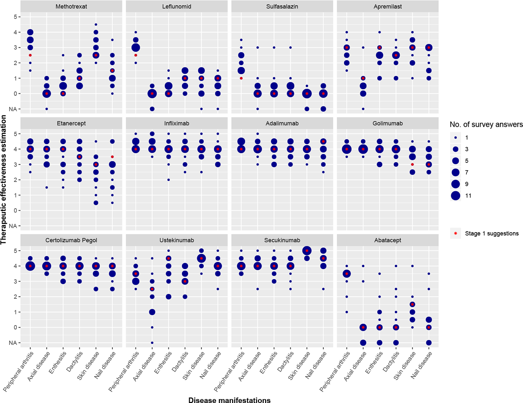 Results from an online survey among physicians querying their perception of efficacies of PsA drugs on different manifestations. Therapeutic effectiveness is estimated by the participants on a scale from 0 (no effect) to 5 (maximal effectiveness); NA = no answer. The size of the dots relates to the number of answers given. Red stars indicate the scores proposed by the initial expert group.
