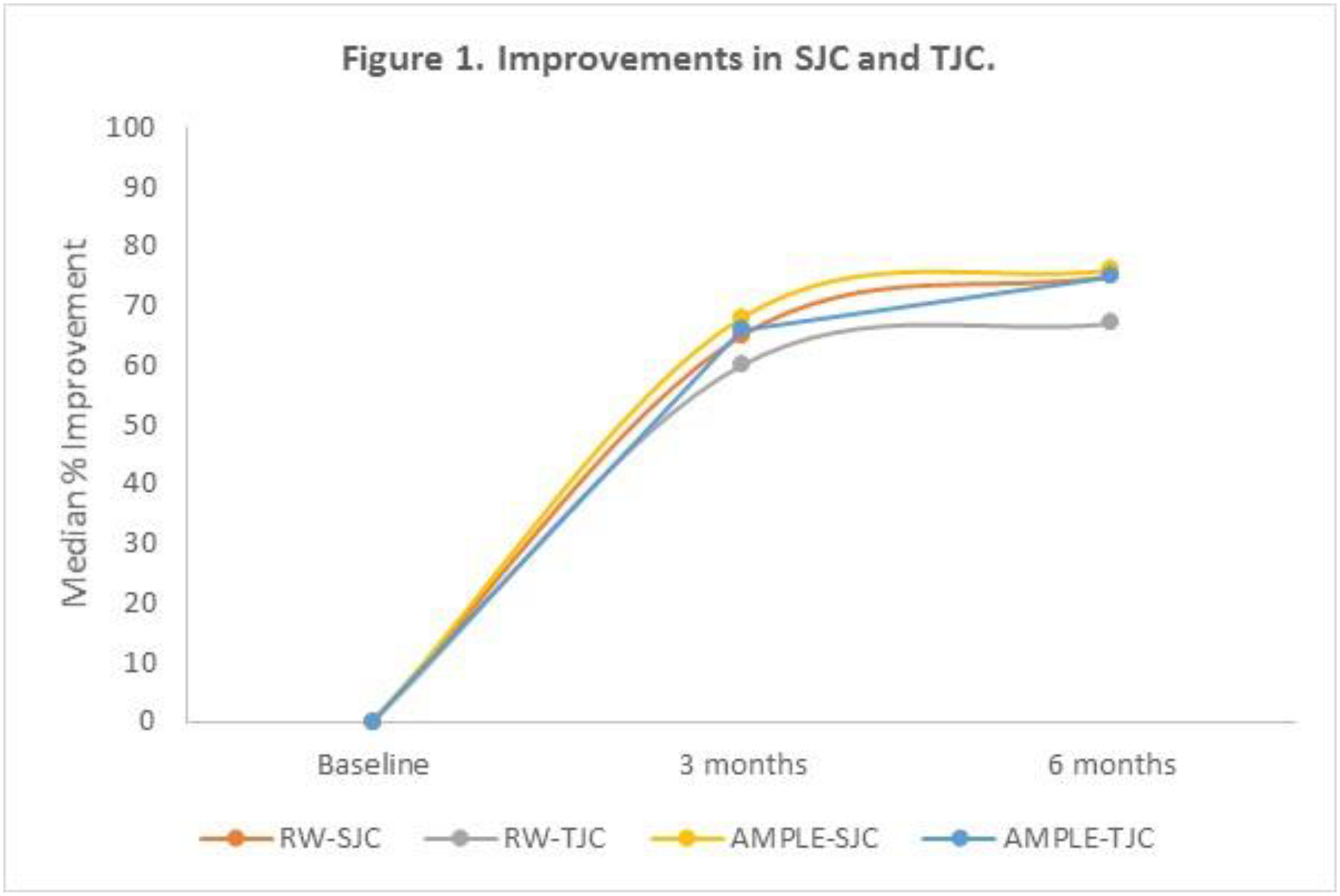Conclusion: Despite differences in patient characteristics, improvements in SJC and TJC, as well as high rates of ACR20 and ACR50, were observed in both trial setting and RW settings. These improvements in disease activity were observed at similar magnitudes in both settings, demonstrating that trial efficacy is achievable in RW clinical practice with abatacept treatment.