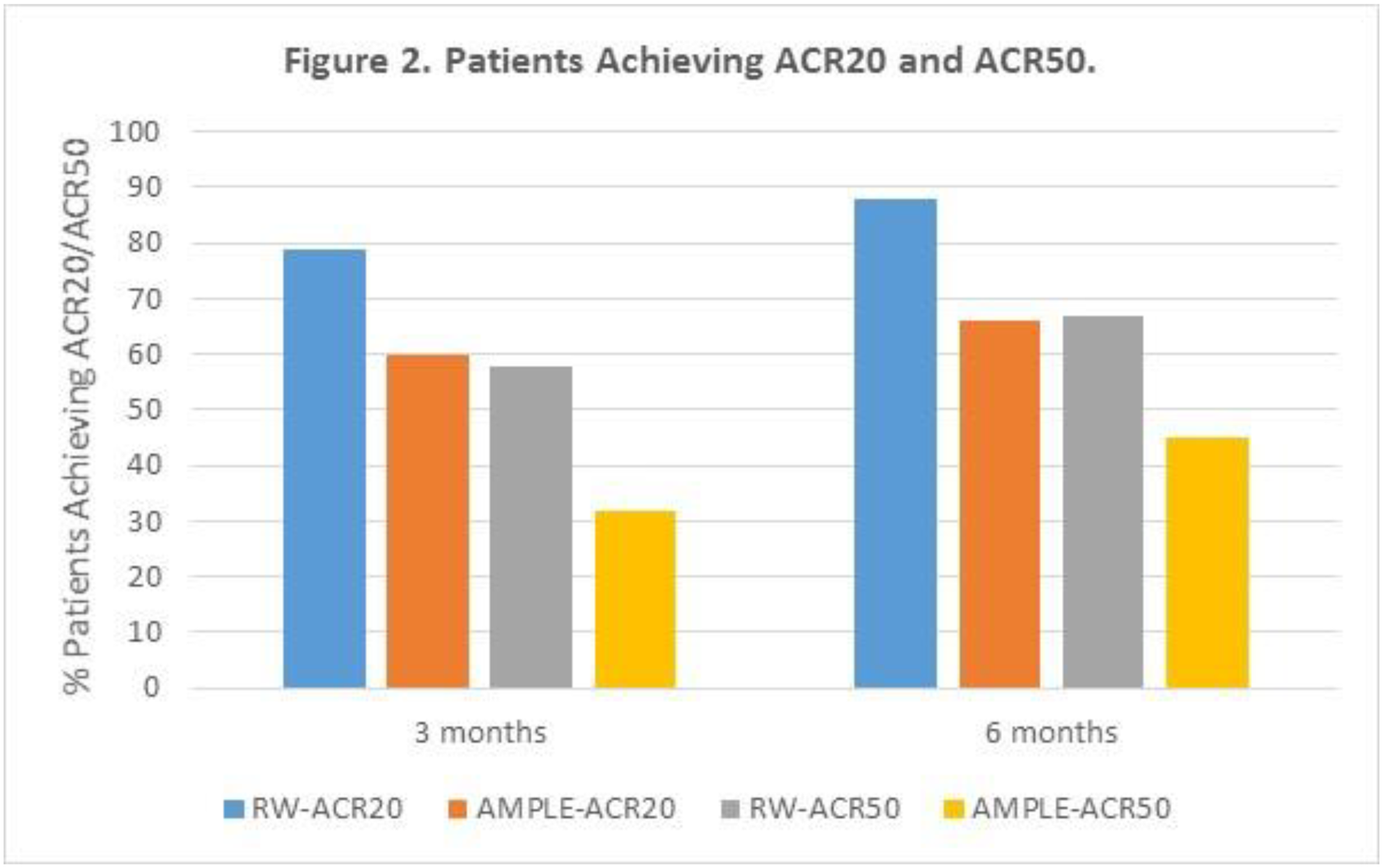 Methods: The RW cohort comprised retrospective patient-level data abstracted by 31 community rheumatologists for adult RA patients treated with abatacept who had an anti-cyclic citrullinated peptide-2 titer ≥250 AU/mL. AMPLE was a phase III, randomized controlled trial of RA patients treated with abatacept that assessed disease measures over a 2-year follow-up. Data included demographics, treatments, labs, and disease measures (tender and swollen joint counts (TJC, SJC), C-reactive protein (CRP), American College of Rheumatology-20 (ACR20) and ACR50 at baseline and 3 and 6 months) and were summarized descriptively. Disease measures were evaluated across AMPLE and RW cohorts.