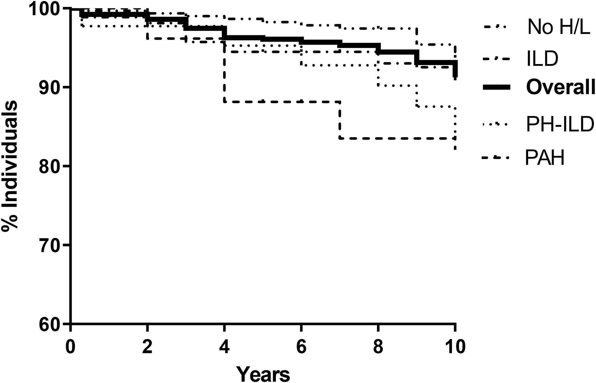 Results: Data from 750 SSc patients (91.9% female; mean (SD) age at first Non-Raynaud symptom 48.4 (15.3) years, median (IQR) disease duration 3 (0-8) years; diffuse cutaneous involvement 162 (21.6%) patients) fulfilling the 1980 ARA and/or 2013 ACR/EULAR classification criteria, were collected. All patients were positive for ANA, anti-Topo-I Abs were found in 235 (31.3%) and Cenp-B Abs in 300 (40%) patients. 98 (13.1%) patients were positive to other Abs (Anti-RNA polymerase III, anti-Pm/Scl) and anti-ENA were negative/unknown for 117 (15.6%) patients. Interstitial lung disease (ILD) was present in 202 (26.9%), pulmonary arterial hypertension (PAH) was found in 29 (3.9%), and 50/750 (6.7%) patients presented pulmonary hypertension combined with ILD (PH-ILD). The overall 10-years survival was 93.1% and, it was significantly impaired by the presence of ILD, PAH or PH-ILD [Figure]. The univariate analysis showed that female gender, higher age at first Non-Raynaud symptom, earlier referral to a tertiary Scleroderma center, absence of any ENA antibodies, and PH-ILD presence were survival predictors. After multivariate analysis the significance of PH-ILD was lost [Table]. Disease duration, basal Rodnan skin score, smoking, renal or gastrointestinal comorbidities, NYHA functional class, steroid or immune-suppressive treatments did not reach the statistically significance.