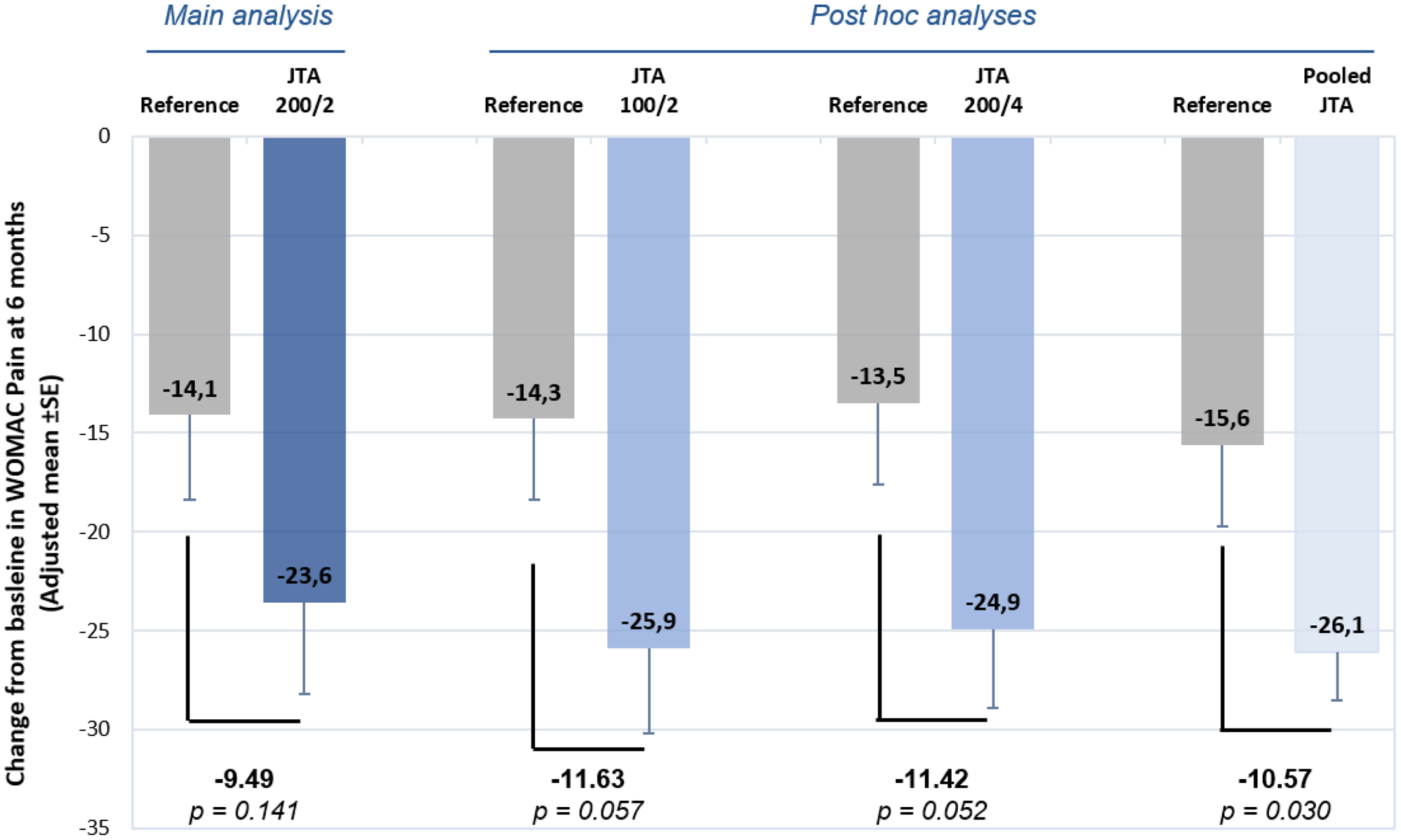 Results: At 6 months, patients in the three JTA-004 groups showed a better improvement in pain compared to patients in the reference group. The between-group difference (between each JTA-004 test group and reference group) in adjusted (adapted to difference in baseline values) mean change in WOMAC