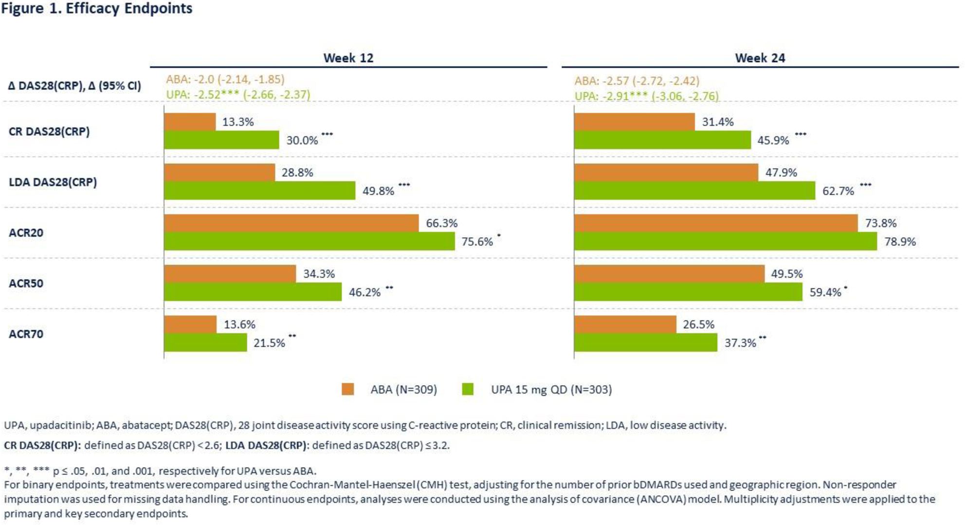 Non-inferiority and superiority were met for UPA vs ABA at Wk 12 for change from BL in DAS28(CRP) (-2.52 vs -2.00; -0.52 [-0.69, -0.35]; p <0.001 for UPA vs ABA). UPA also demonstrated superiority to ABA in achieving DAS28(CRP) <2.6 (30.0% vs 13.3%; p <0.001 for UPA vs ABA;
