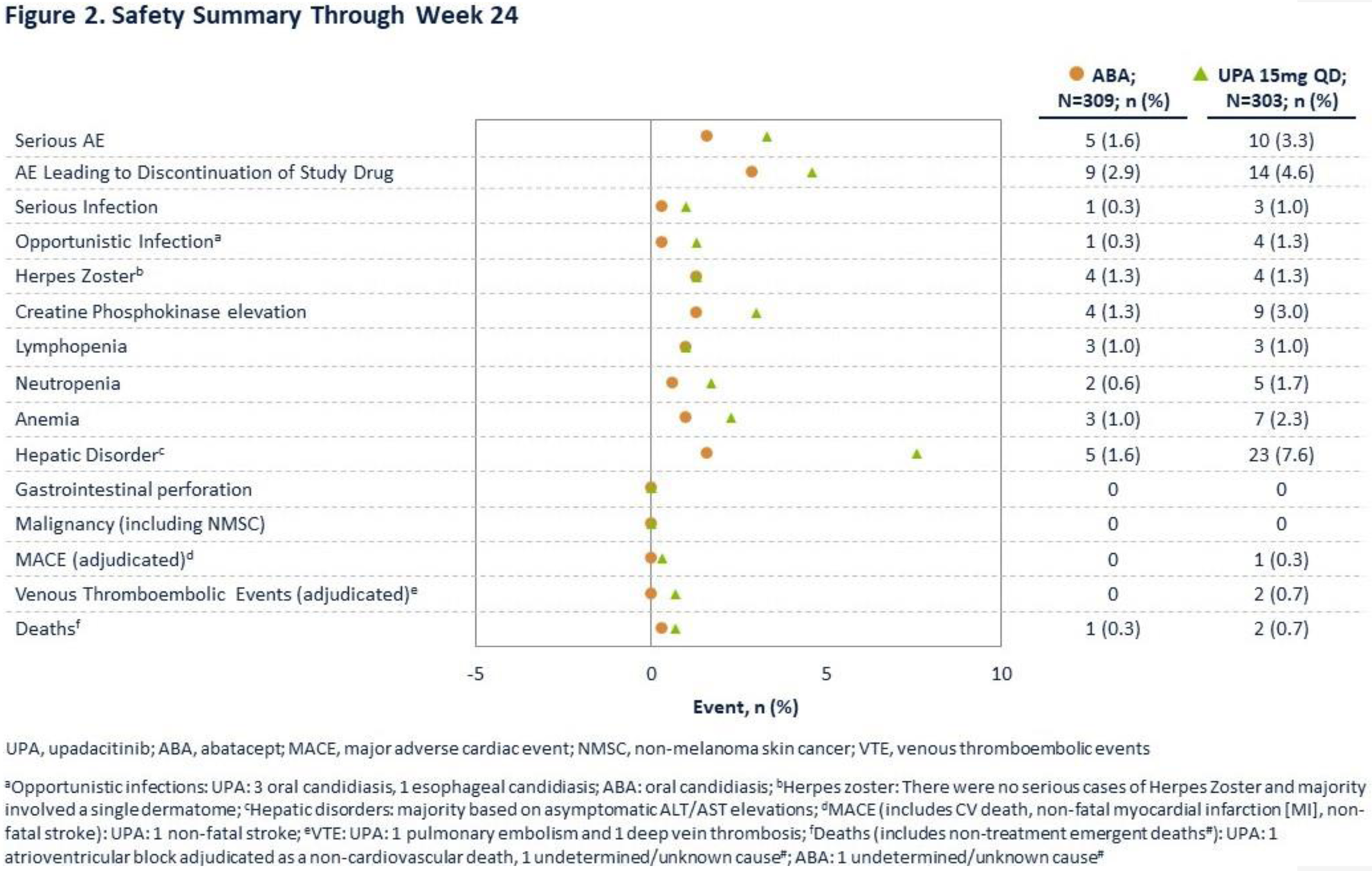 Results: Of 612 pts treated; 67% of pts had received 1 prior bDMARD, 22% received 2 prior bDMARDs, and 10% received ≥ 3 prior bDMARDs. 549 (90%) completed 24 wks of treatment. Common reasons for study drug discontinuation were AEs (UPA, 3.6%; ABA, 2.6%) and withdrawal of consent (UPA, 1.7%; ABA, 2.6%).