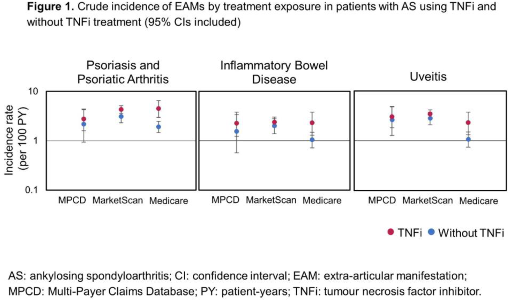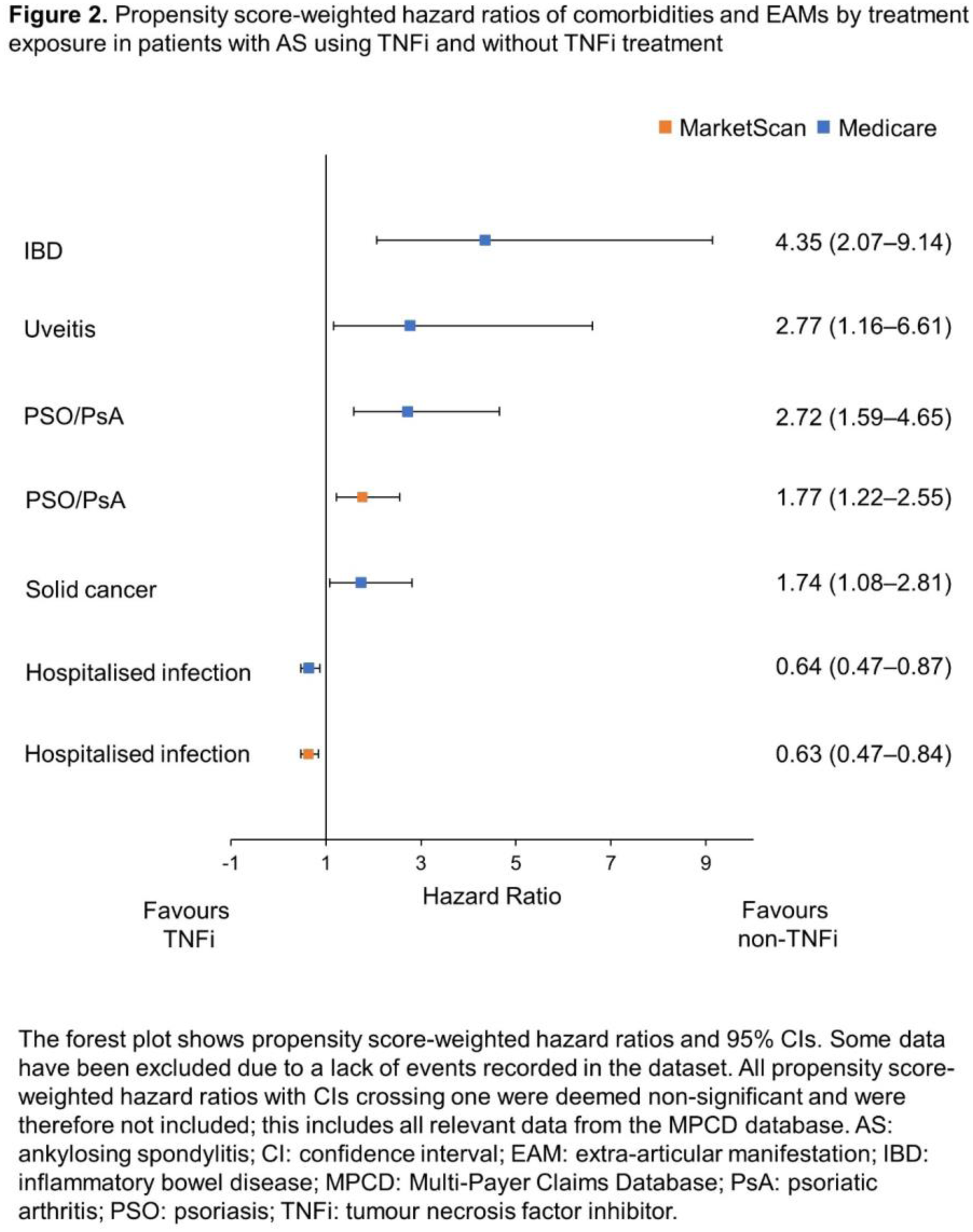 Methods: This was a retrospective, observational cohort study using data from 3 healthcare insurance claims databases: Multi-Payer Claims Database (MPCD Optum Insight; 2007–2010), Truven MarketScan ® (2010–2014) and US Medicare Fee-for-Service Claims database (2006–2014). Eligible pts: ≥20 years (yrs) for MarketScan/MPCD or ≥65 yrs for Medicare, had an AS diagnosis (≥2 International Classification of Disease, 9 th version [ICD-9] diagnosis codes of 720.0 from a rheumatologist) and ≥12 months’ continuous medical and pharmacy enrolment prior to AS diagnosis (AS index date). Pts with AS not receiving tx were excluded. Tx exposure was reported from the first date of a new prescription/administration of an AS tx (no prior exposure) after the AS index date. Crude incidence rates (IR; shown as cases/100 pt-yrs) were calculated for EAMs (uveitis, psoriasis [PSO], psoriatic arthritis [PsA], inflammatory bowel disease [IBD]), with follow-up until the earliest of: death, lost medical/pharmacy coverage, study period end, first outcome occurrence, tx switch/discontinuation. Hazard ratios (HRs) of comorbidities (hospitalised infection, solid cancers) and EAMs for propensity score (PS)-matched pt groups were calculated using Cox proportional hazard regression models. Pts with the specific comorbidity/EAM of interest prior to AS index date were excluded. PS analyses assessed probability of TNFi initiation vs non-TNFi tx and adjusted for factors including comorbidities and demographics. HRs with confidence intervals crossing 1 are not reported.