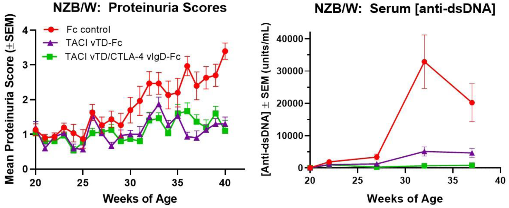 Methods: We used our directed evolution platform to identify variant domains of the TNF family receptors TACI or BCMA that exhibit enhanced affinity for BAFF and APRIL as compared to their wild-type (WT) counterparts. These variant TACI or BCMA domains (vTD), alone or together with platform-derived CTLA-4 domains (vIgD), were fused to a modified human IgG1 Fc lacking effector function, yielding a panel of immunomodulatory molecules: TACI vTD-Fc, BCMA vTD-Fc, TACI vTD/CTLA-4 vIgD-Fc, & BCMA vTD/CTLA-4 vIgD-Fc. All were evaluated for functional activity: 1) in vitro in primary human B cell & MLR assays and in a Jurkat/NF-kB reporter cell line expressing TACI, and 2) in vivo in standard immunization models, and in the bm12-induced and NZB/NZW spontaneous mouse models of lupus.