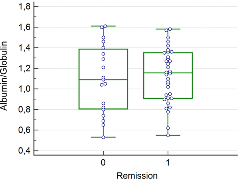 , p=0.13) and proteinuria decreased (3.5 vs. 0.6 g/day, p<0.001). Eighteen patients achieved complete remission (CR), 16 partial remission and 21 did not achieve remission. None progressed to ESRD and two patients died, both from sepsis. A/G at the time of biopsy did not differ between group which achieved CR/PR vs. no remission (p>0.05;