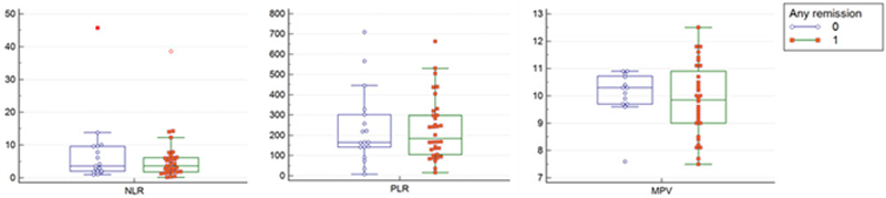 Results: We have included 55 patients (80% women) with biopsy-proven LN (age at biopsy 38±13 years). On renal histology, one patient was class I LN, two patients were class II, 7 were class III, 5 were class III+V, 23 were class IV, two were class IV+V, 11 class VI and 4 had other features. Median baseline NLR was 3.64 (IQR: 1.85, 6.93), PLR was 167 (IQR: 116, 300) and MPV was 10.0 (IQR: 9.2, 10.8). There were no differences in any of the three parameters between different classess of LN (all p>0.05). Eighteen patients achieved complete remission (CR), 16 partial remission and 21 did not achieve remission. None progressed to ESRD and two patients died, both from sepsis. There no differences in NLR, PLR and MPV at the time of biopsy between group which achieved CR/PR vs. no remission (all p>0.05;