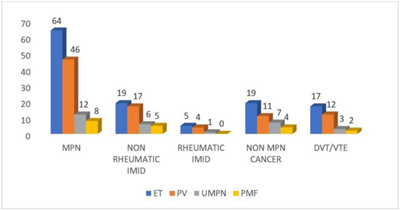 ABBREVIATIONS: DVT/VTE: Deep vein thrombosis/ Venous thromboembolism. ET: Essential Thrombocythemia, IMID: Immune Mediated Diseases, PV: Polycythemia Vera; MPN: Myeloproliferative Neoplasms; PMF: Primary myelofibrosis; UMPN: Undifferenciated myeloproliferative neoplasms.