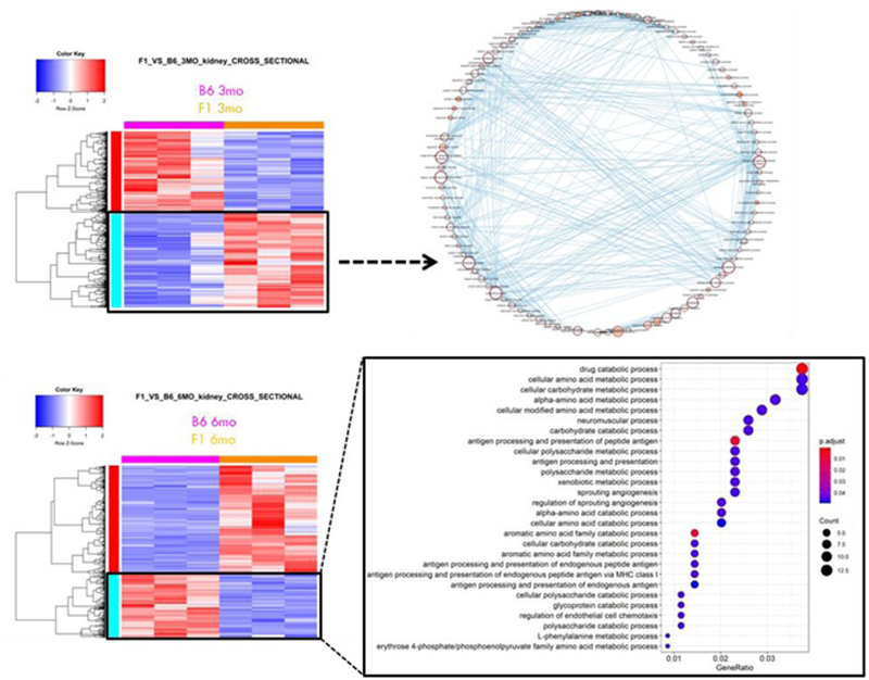 Pathways linked to cell metabolism were overrepresented among 3-month upregulated and 6-month lupus mice (F1) downregulated DEGS ( differentially expressed genes ) compared to controls (C57BL/6).