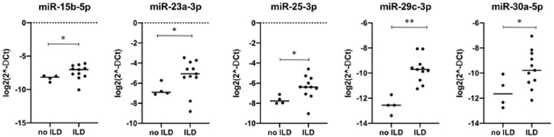 Results: Among all miRNAs analyzed we found that miR-15b-5p, miR-23a-3p, miR-25-3p, miR-30a-5p and miR29c-3p were up-regulated in ASSD-ILD patients (p<0.05) as compared to patients without lung involvement (