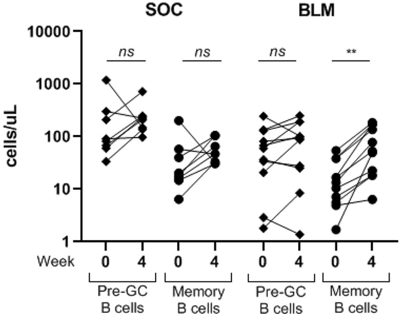 Change in pre-germinal center and memory B cell counts from baseline to week 4 of patients with SLE or LN treated with SOC (n=8) or SOC+BLM (n=11).