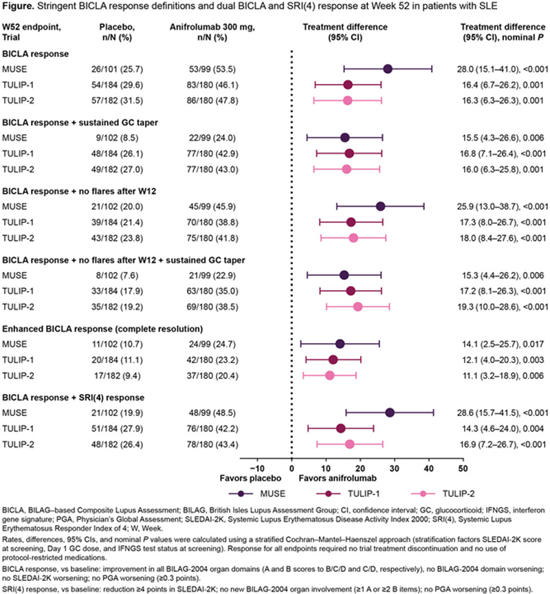 Results: Evaluated patients received anifrolumab 300 mg (MUSE, n=99; TULIP-1 and TULIP-2, n=180) or placebo (MUSE, n=102; TULIP-1, n=184; TULIP-2, n=182). Response rate differences favoring anifrolumab 300 mg over placebo were observed for all 5 endpoints across MUSE, TULIP-1, and TULIP-2 (