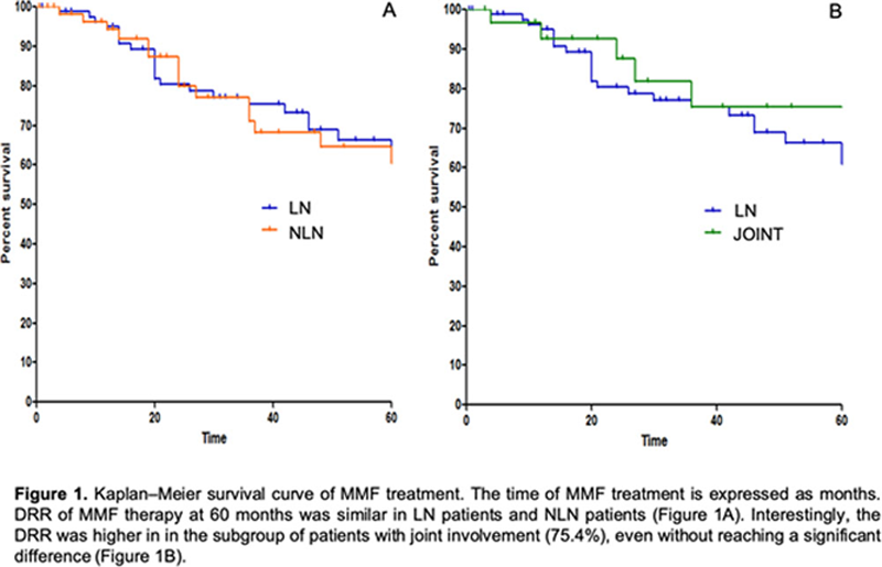 Conclusion: The evaluation of a large SLE cohort demonstrated a good retention rate for MMF. In particular, our results demonstrated that MMF is also a safe and effective drug for SLE manifestation other than LN, in particular for joint involvement. Moreover, it is able to control disease activity and to prevent the progression of chronic damage.