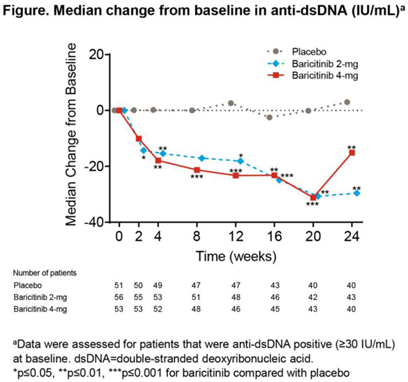 Results: Among patients who were anti-dsDNA positive at BL, significant decreases of anti-dsDNA antibodies were observed for BARI 2-mg and 4-mg compared to PBO beginning at Wks 2 and 4, respectively, and continuing through Wk 24 (