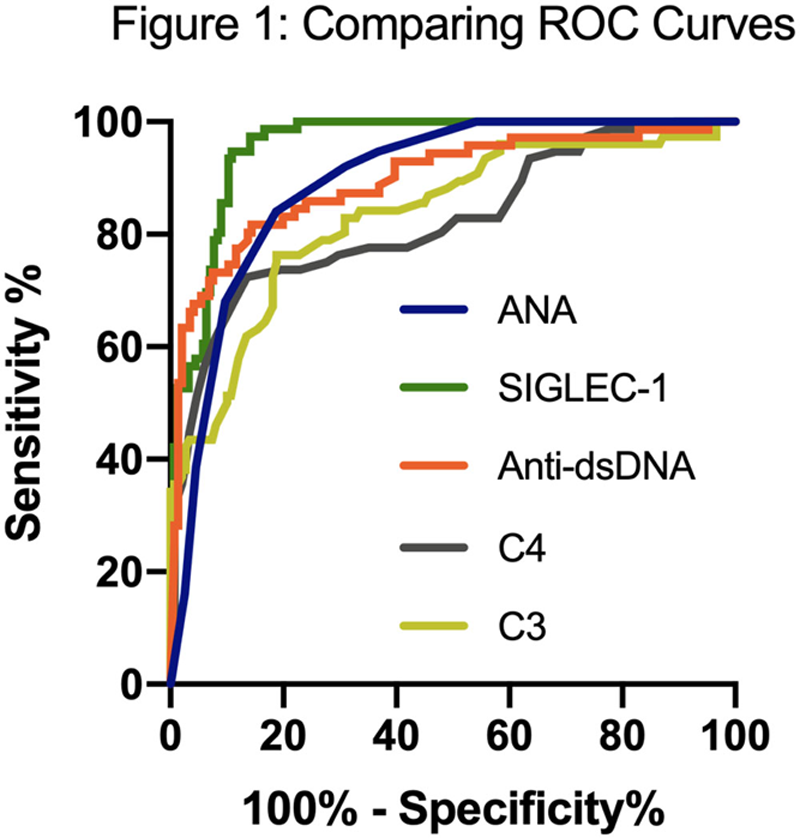Objectives: To evaluate and compare the diagnostic utility of the type I IFN induced SIGLEC-1 with established biomarkers in the initial diagnosis of the disease.