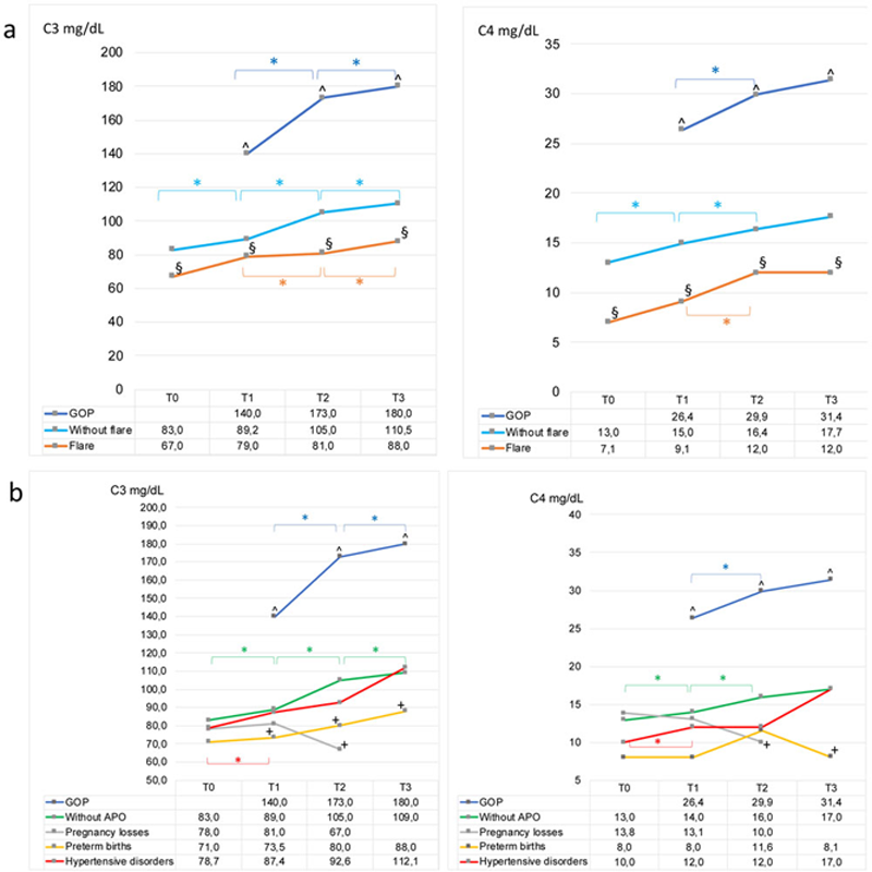 Variations of C3 and C4 median levels (mg/dL) throughout pregnancy in GOP 1 and in SLE pregnancies without and with flare (a) and without and with APO (b).