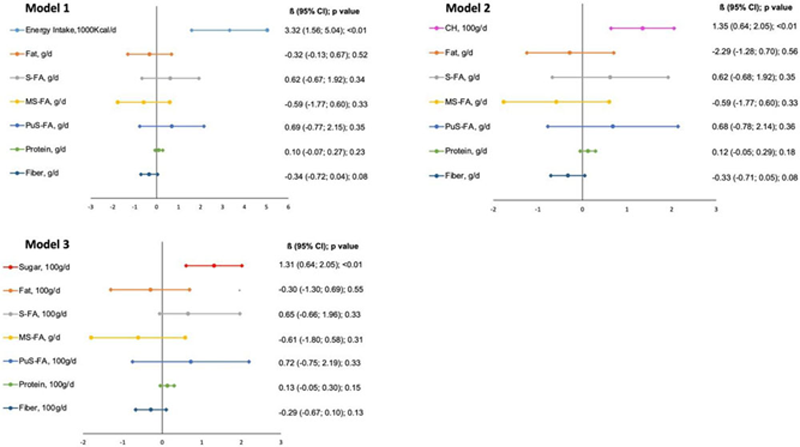B, linear regression coefficient; CH, carbohydrates; CI, confidence interval; MS-FA, monosaturated fatty acids; PuS-FA, polyunsaturated fatty acids, S-FA, saturated fatty acids.