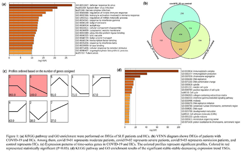 Methods: The transcription profile of SLE (GSE38351) and COVID-19 (GSE161778) were obtained from the Gene Expression Omnibus database (GEO). R package was used to find differentially expressed genes (DEGs) between lupus patients and HCs. After background adjustment and other pre-procession, DEGs were extracted from the peripheral blood of patients with COVID-19 at three different disease progression(moderate, severe and remission status). The Short Time-series Expression Miner (STEM) was used to cluster and compare average DEGs with coherent changes. The different expression patterns of time-series genes (TSGs) were also compared among these patients. GO and KEGG pathway enrichment analysis of TSGs and DEGs were performed by Metascape.