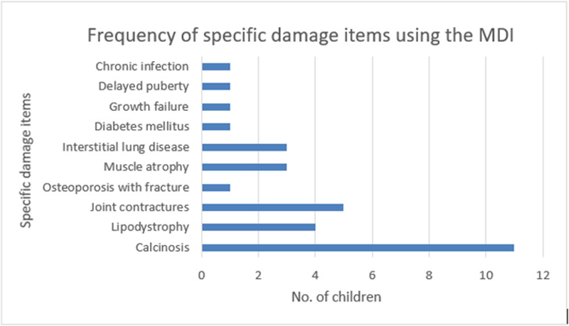 Conclusion: Nearly half of the patients had damage in at least one organ using the MDI. Cutaneous damage was the most common, followed by skeletal, muscle, pulmonary and endocrine damage. Longer duration of untreated/ sub-optimally treated disease significantly increases the risk of cumulative damage, highlighting the need for an early diagnosis and referral to pediatric rheumatology services.