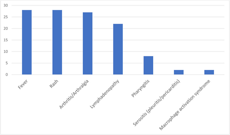 Conclusion: The most common presenting symptoms in our cohort were fever and salmon-colored rash. Tocilizumab is an alternative treatment modality in cases with chronic arthritis and IL-1 inhibitors are an alternative for systemic course of disease. bDMARDs, especially IL-1 inhibitors are highly effective for refractory patients with AOSD.