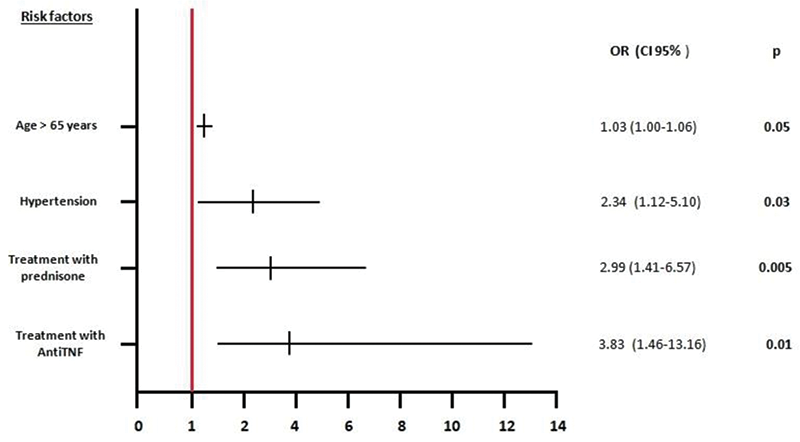 | Hypertension, n(%) | 165 (42.0) | 19 (61.3) | 146 (40.3) | 0.04 | Anti-TNFa, n (%) | ||||