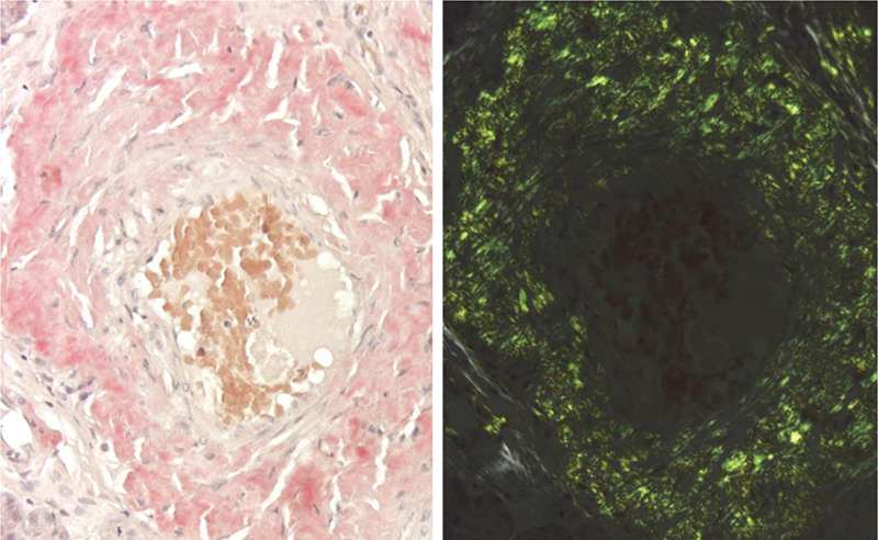 Congo red staining and darkfield microscopy demonstrating amyloid deposits.