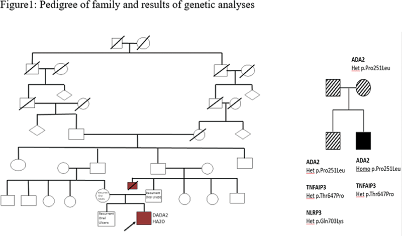 Conclusion: This is the first case of AA amyloidosis associated with ADA2 and TNFAIP3 (A20) variants. ADA2 p.Pro251Leu variant has previously been validated as likely pathogenic, and our patient’s clinical findings were mainly compatible with DADA2. On the other hand, TNFAIP3 gene p.Thr647Pro mutation has been reported as variant of unknown significance, but it may have contributed to the DADA2 associated increased risk of amyloidosis. A better response of proteinuria to adalimumab treatment indicates superiority of anti-TNFs in DADA2 patients compared to anti-IL-1 drugs.