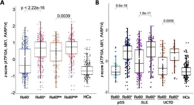 Three genes common to RNA-Seq, DNA methylation and GWAS analysis characterize anti-Ro60 + patients. (A) ATP10 / MX1 / PARP14 z -score analyses were performed for 731 patients and 254 HCs according to anti-Ro60 expression. (B) ATP10 / MX1 / PARP14 z -score analyses were performed for 286 pSS, 351 SLE and 94 UCTD patients and 254 HCs. Two-tailed pairwise Wilcoxon-rank sum test results are shown. Plots show median, with error bars indicating ± interquartile range. (pSS: primary Sjögren’s syndrome, SLE: systemic lupus erythematosus, UCTD: undifferentiated connective tissue disease, HCs: healthy controls).
