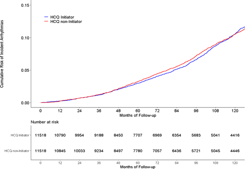 Results: We identified 11,518 HCQ initiators (10,655 RA and 863 SLE patients, mean ± SD age 55.9 ± 15.1 years, 76.1% female) and 11,518 HCQ non-initiators (10,639 RA and 879 SLE patients, mean ± SD age 56.0 ± 16.2 years, 76.4% female) after 1:1 propensity score matching. Over the mean follow-up of eight years, there were 1,610 and 1,646 incident arrhythmias in the HCQ initiator and non-initiator groups, respectively. The crude incidence rates of arrhythmia were 17.5, and 18.1 per 1,000 person-years, respectively. Cumulative risk of incident arrhythmia remained similar for both groups. (