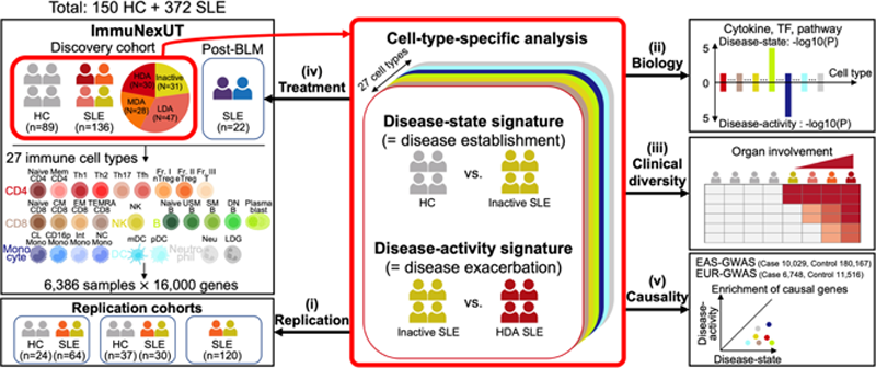 Methods: We conducted a large-scale bulk transcriptome study of 6,386 RNA-sequencing data including 27 purified immune cell types in peripheral blood from 136 SLE and 89 healthy donors in the Immune Cell Gene Expression Atlas from the University of Tokyo (ImmuNexUT) cohort 1 . At enrollment, SLE patients had diverse clinical manifestations (disease activity, organ involvement and treatment profiles) and 22 patients were re-evaluated after belimumab treatment.