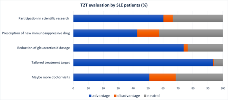 Conclusion: Despite many SLE patients being satisfied with their treatment and health status, T2T is considered an important subject to be studied in clinical trials. Advantages did overweigh possible disadvantages of T2T with the possibility of more doctors’ visits and the prescription of a new drug as biggest disadvantage. Quality of life named as most important treatment goal emphasizes its importance as outcome parameter. Most patients would be willing to participate in a trial about T2T.