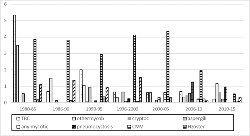 Incidence rate per 1000 personyears over time for hospitalisation with opportunistic infections in RA patients.
