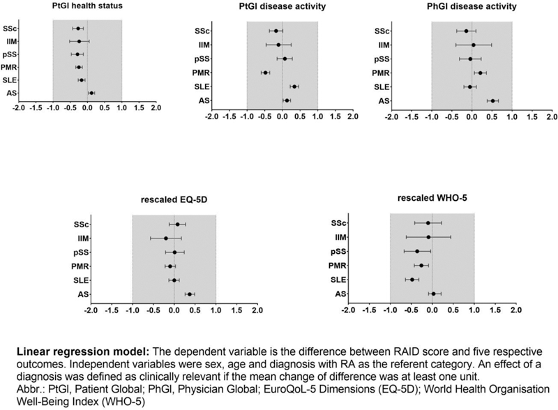 Conclusion: The RAID score performed comparably well across all diagnoses investigated. These findings support the use of the RAID for measuring the impact of disease not only in RA, but also in AS, SLE, PMR, pSS, IIM and SSc.