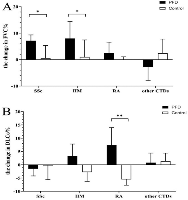 Conclusion: The response of pulmonary function to PFD were varied in different CTD-ILD subsets. SSc and IIM pts acquired obviously improvement on FVC%, especially with high baseline FVC group. DLco% elevated in RA-PFD, highlight those baseline Low-DLco and No-UIP pts.