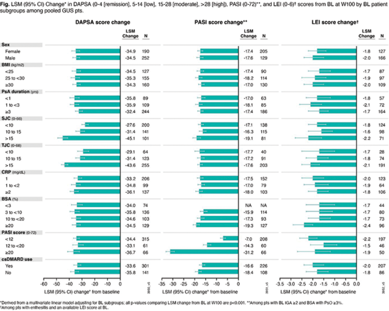 Conclusion: GUS significantly improved PsA signs and symptoms through W100 across all BL pt subgroups evaluated, including pts with highly active disease, and regardless of dosing regimen.
