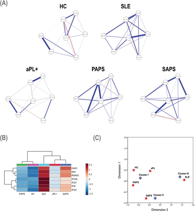 Results: An overall activation of ISG was noted across APS subsets, but certain differences were noted among genes. Whereas some ISG were already upregulated in the aPL positive group compared to HC (IFI44, IFI44L, MX1, IFI27, OAS1 and RSAD2, all p<0.050), other ISG were only in increased SLE (IFI6), MX1 differed between SLE and SAPS, and IFI27 and OAS1 showed differences between PAPS and SAPS. The composite IFN score revealed quantitative differences in the IFN pathway activation across APS subsets, being elevated in aPL carriers/PAPS groups compared to HCs (both p<0.050) and increasing in SAPS (p<0.010) and SLE (p<0.001) groups. Network analyses (