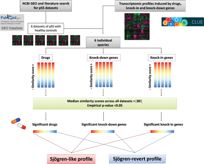 Results: 1091 peripheral blood transcriptomes were analyzed from 6 independent studies (906 patients with pSS and 185 healthy controls). Our analysis identified 11 transcriptomic drug signatures significantly associated with pSS signature. We identified 72 transcriptomic knock-in (11) or knock-down (61) gene signatures significantly associated with that of pSS, including 21 with a negative similarity score (