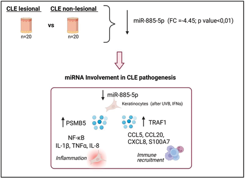 Methods: Paired skin biopsies from CLE lesional (n=20) and non-lesional skin (n=20) were obtained. MiRNA microarray screening was performed using TaqMan MicroRNA Array. Validation was performed in a new cohort of FFPE skin samples by qRT-PCR (n=20) . In situ hybridization was performed to identify the skin cell type involved in selected miRNAs. Next, in vitro experiments using primary skin and immune cells were performed in order to discover their role in CLE pathogenesis. A microarray screening and luciferase assay were performed to find miR-885-5p altered gene expression, molecular pathways and target genes.