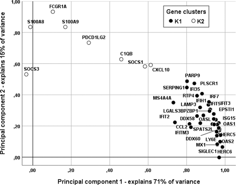 Results: Out of 128 IRGs, 46 were highly expressed in SLE patients as compared to controls and seemed to co-express in mainly two distinct clusters,