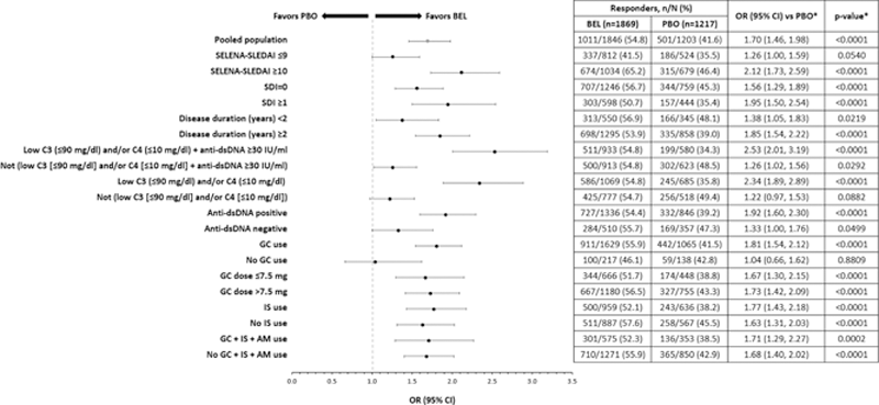 *OR (95% CI) and p-value are from a logistic regression model for BEL vs PBO comparison with covariates of treatment group, study and BL SELENA-SLEDAI score (≤9 vs ≥10)